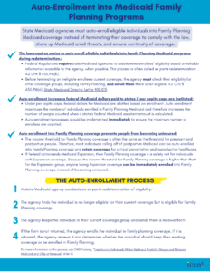 State Medicaid agencies must auto-enroll eligible individuals into Family Planning Medicaid coverage instead of terminating their coverage to comply with the law, shore up Medicaid amid threats, and ensure continuity of coverage.